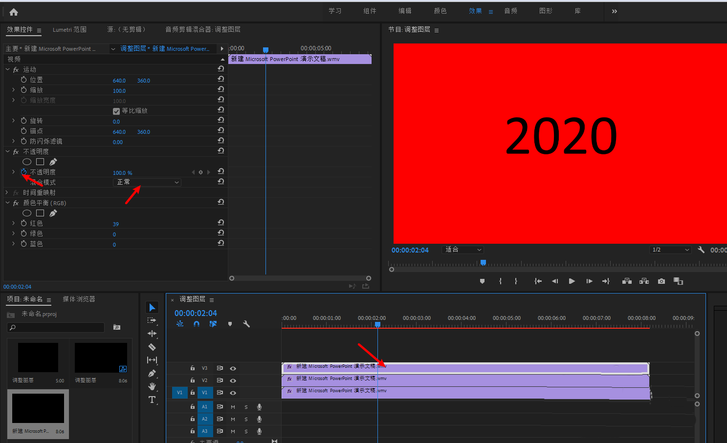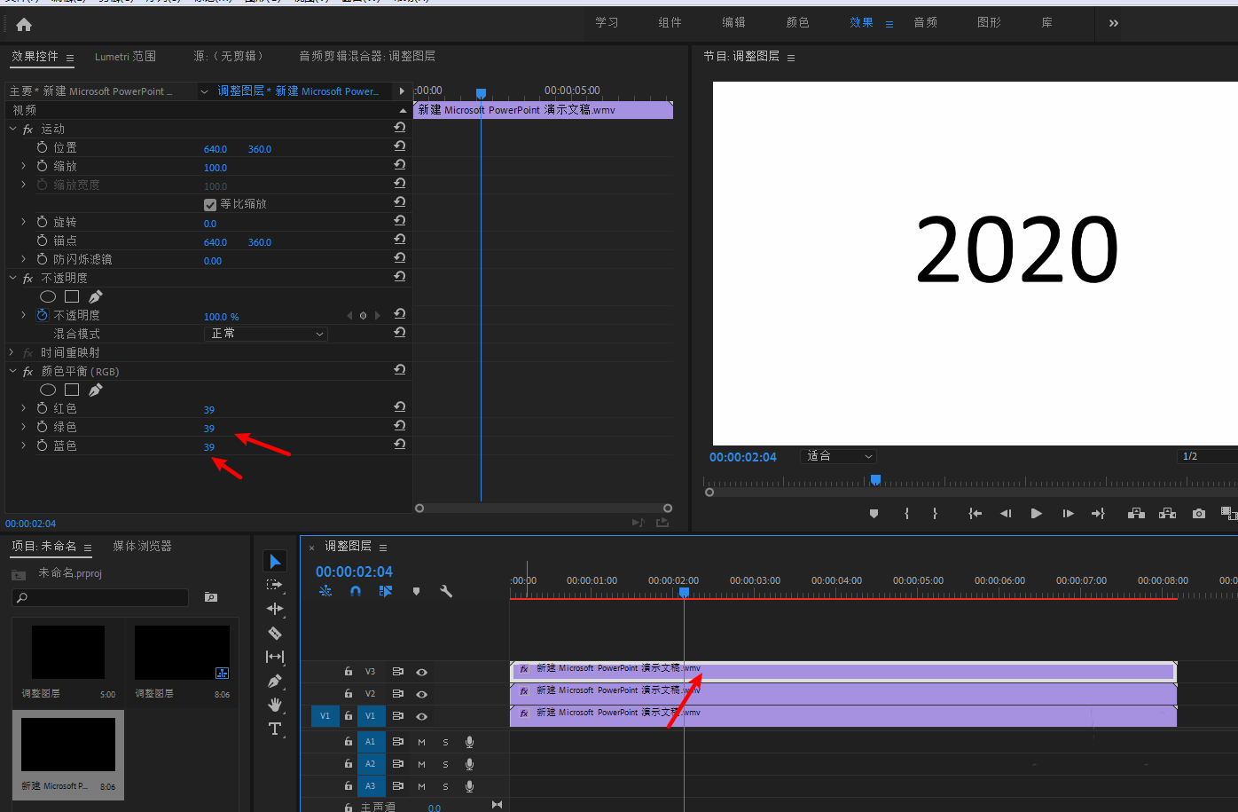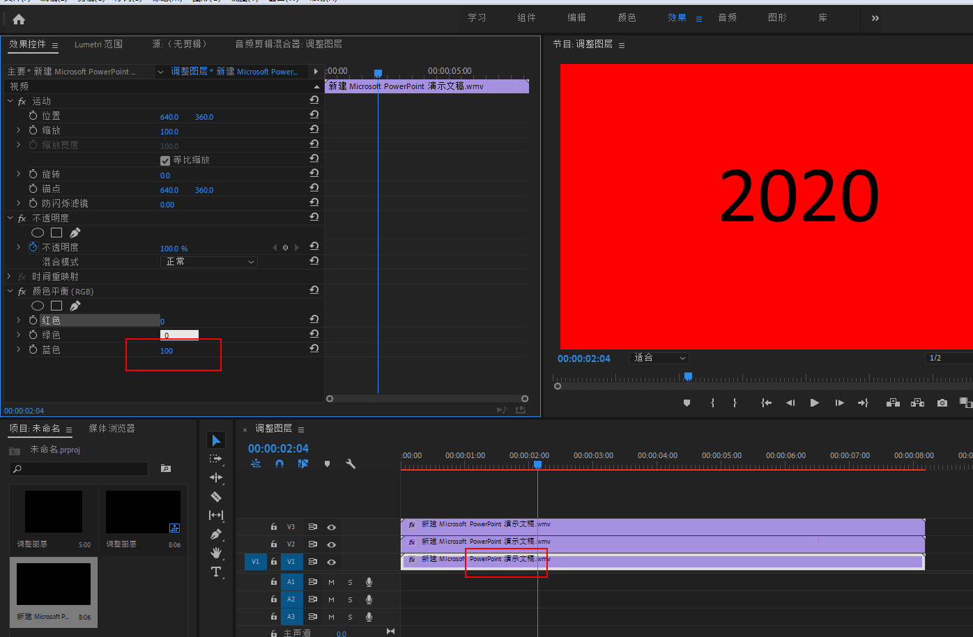 2、选效果,搜索RGB,把颜色平衡(RGB)分别加入到三层素材上,如下。