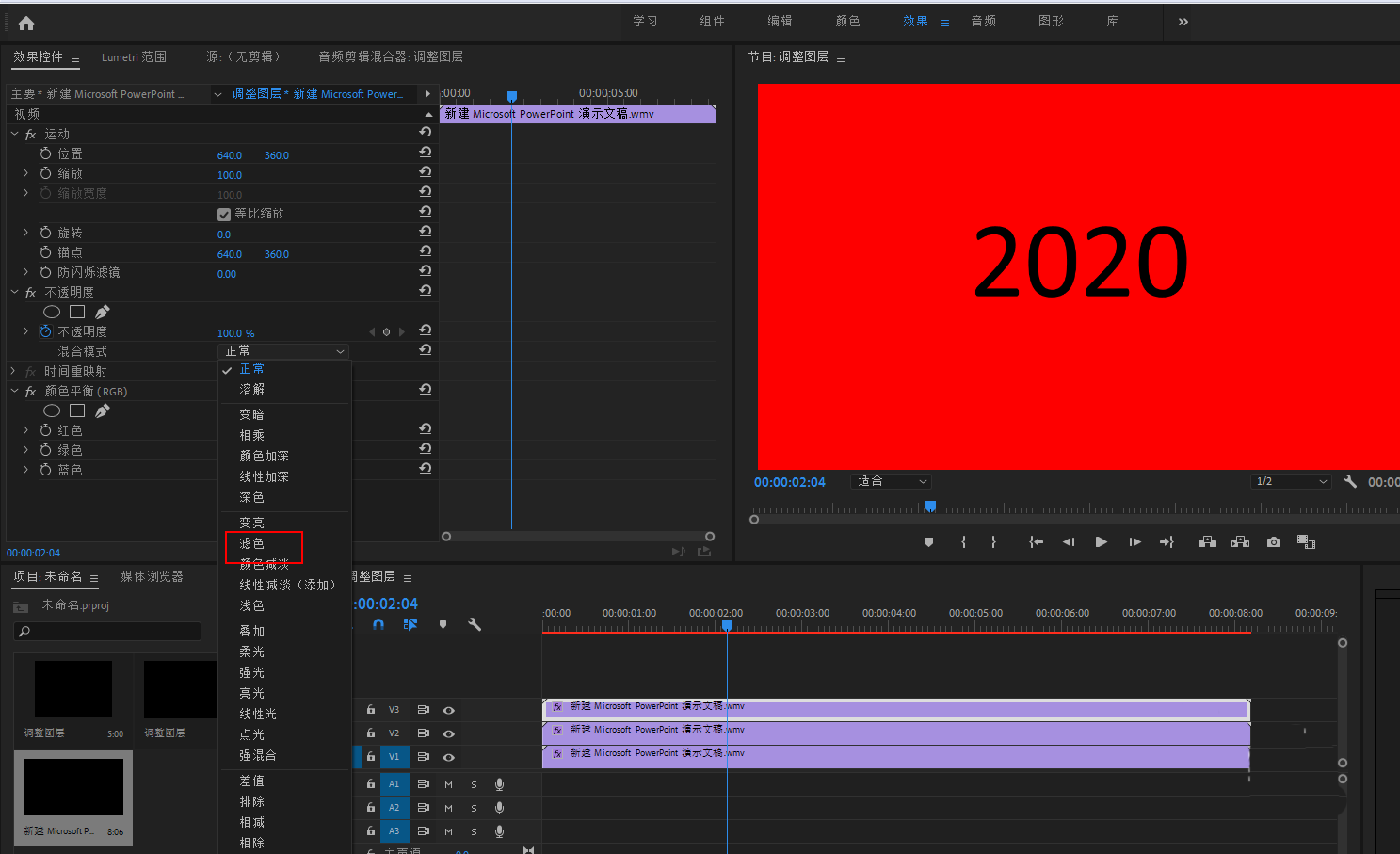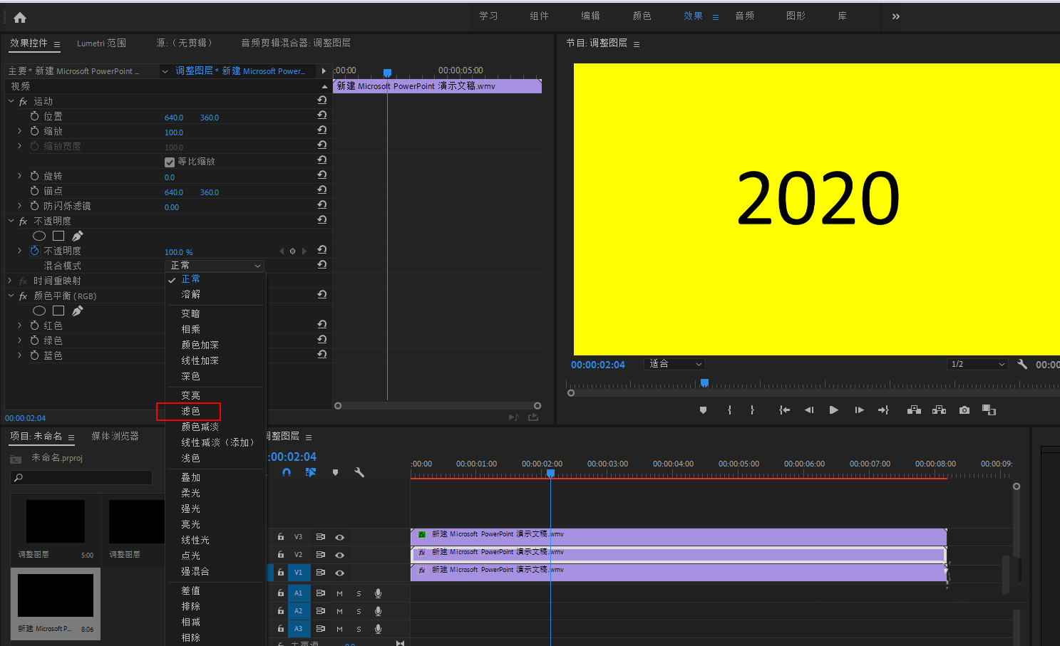 5、点击第一层素材,打开不透明度,点击混合模式下选滤色。