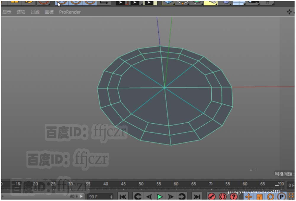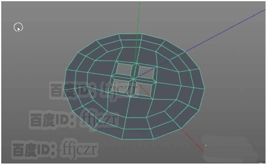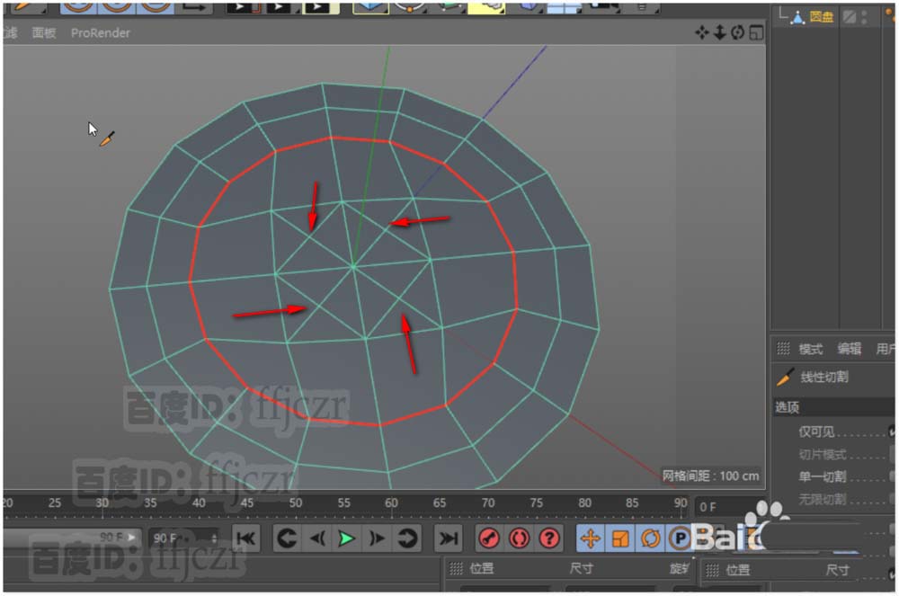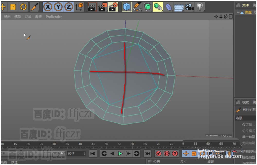 3、用切刀工具根据坐标轴与圆盘的结构添加二条形成圆心的结构线;圆心的点将是本次调整结构线的关键。