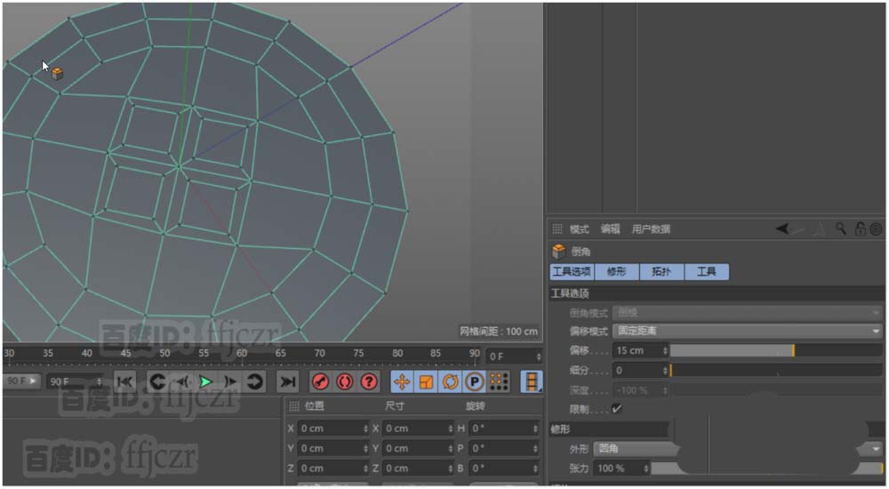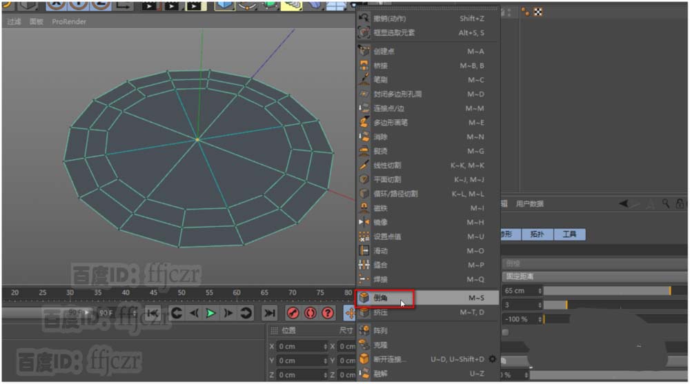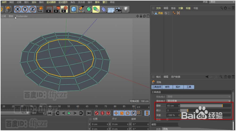 4、在点模式中,选中圆心点进行倒角;倒角的细分数与圆盘的分段数要契合,在这里倒角的参数是:偏移65,细分为3,深度为-100。