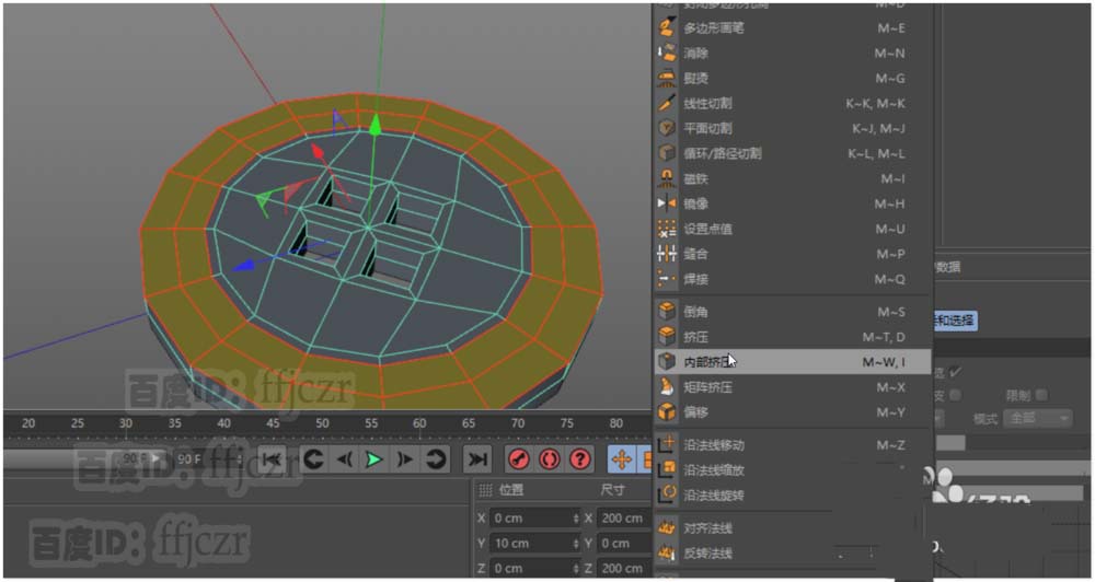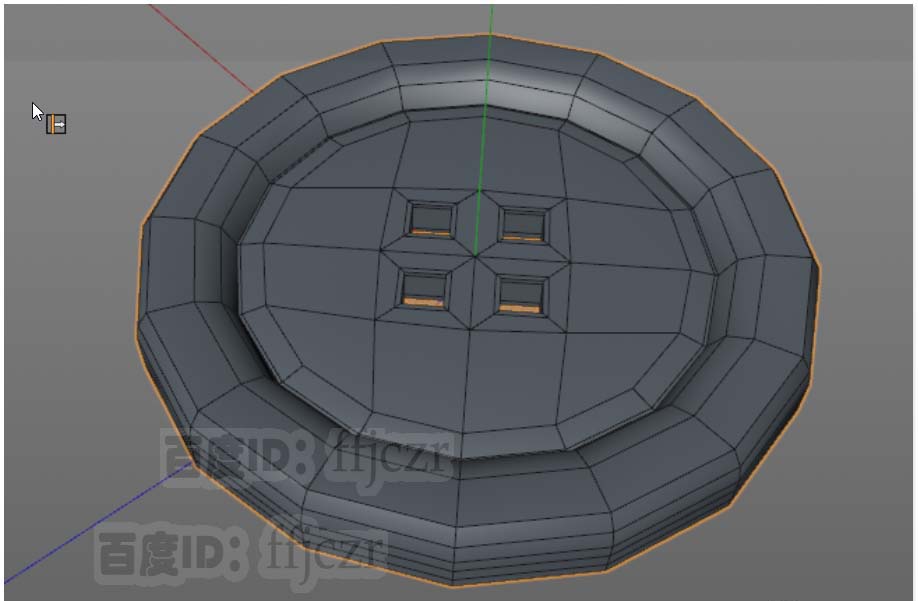 10、细节的调整,在面模式中选中钮扣的上表面,进行内部挤压,通过移动及缩放命令;调整钮扣的外沿,得到钮扣的凹凸及圆弧造型。