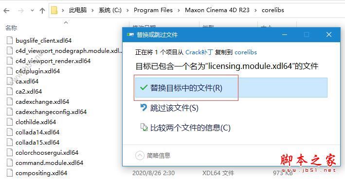 6、复制Crack文件中的licensing.module.xdl64到C:Program FilesMaxon Cinema 4D R23corelibs下替换