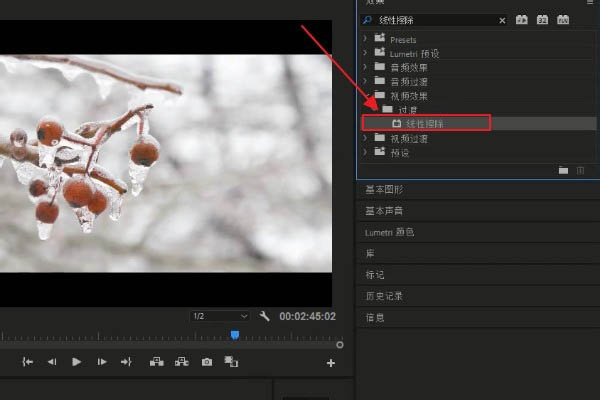 3、然后我们在【效果】界面中选择【线性擦除】功能,添加给上方的视频素材。