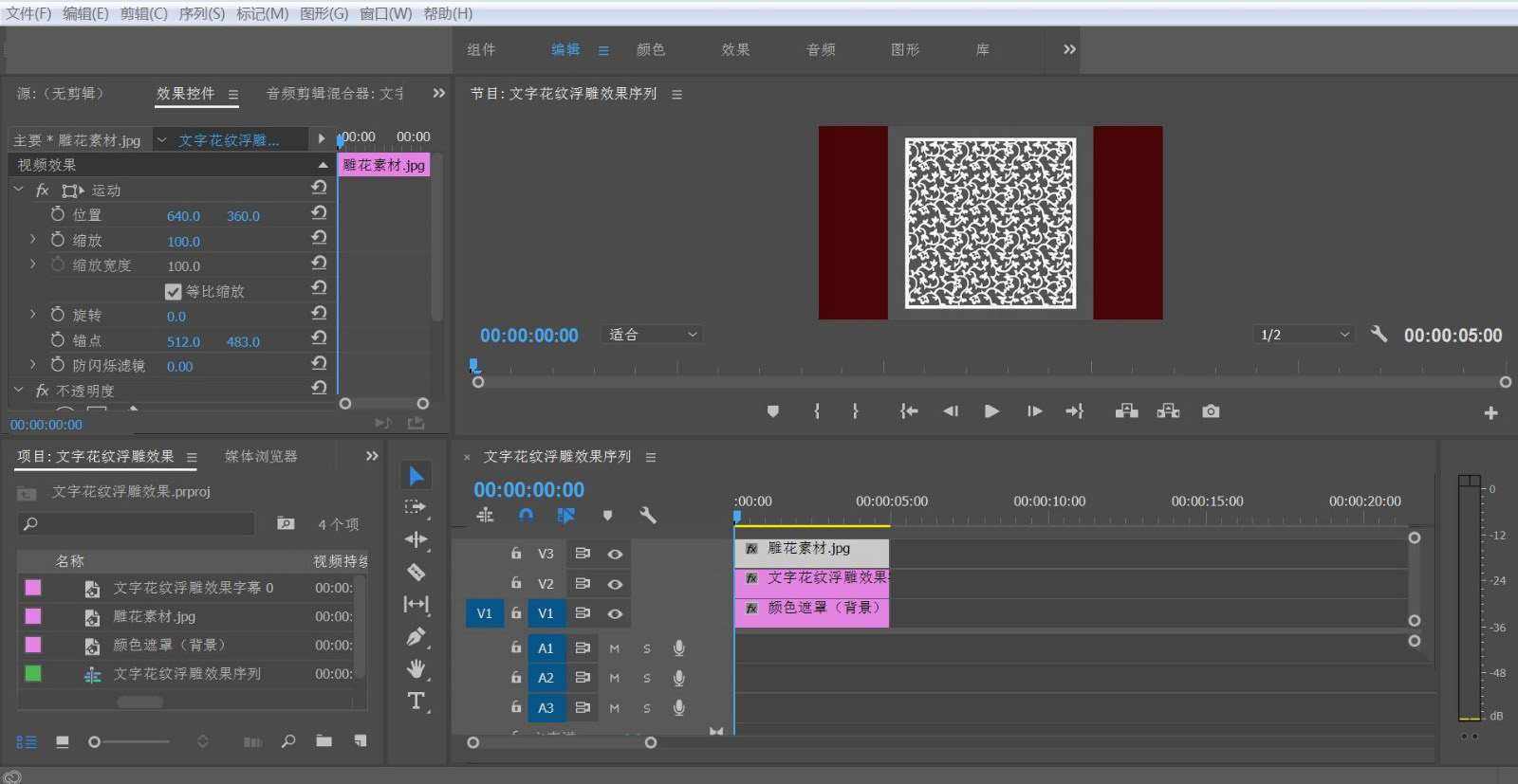 新建项目,序列,颜色遮罩背景,导入雕花素材。