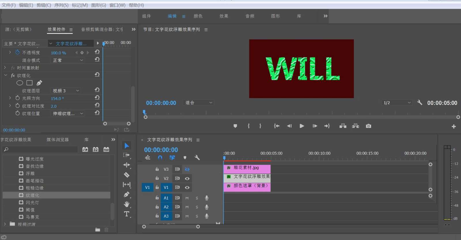 给字幕素材,添加纹理化效果,设置如图所示,视频轨道3切换视频轨道输出。