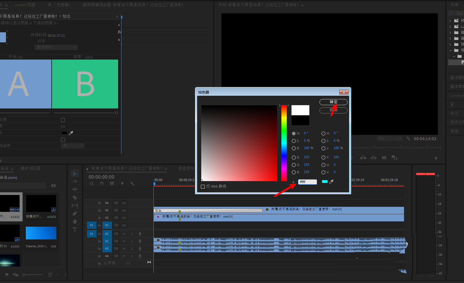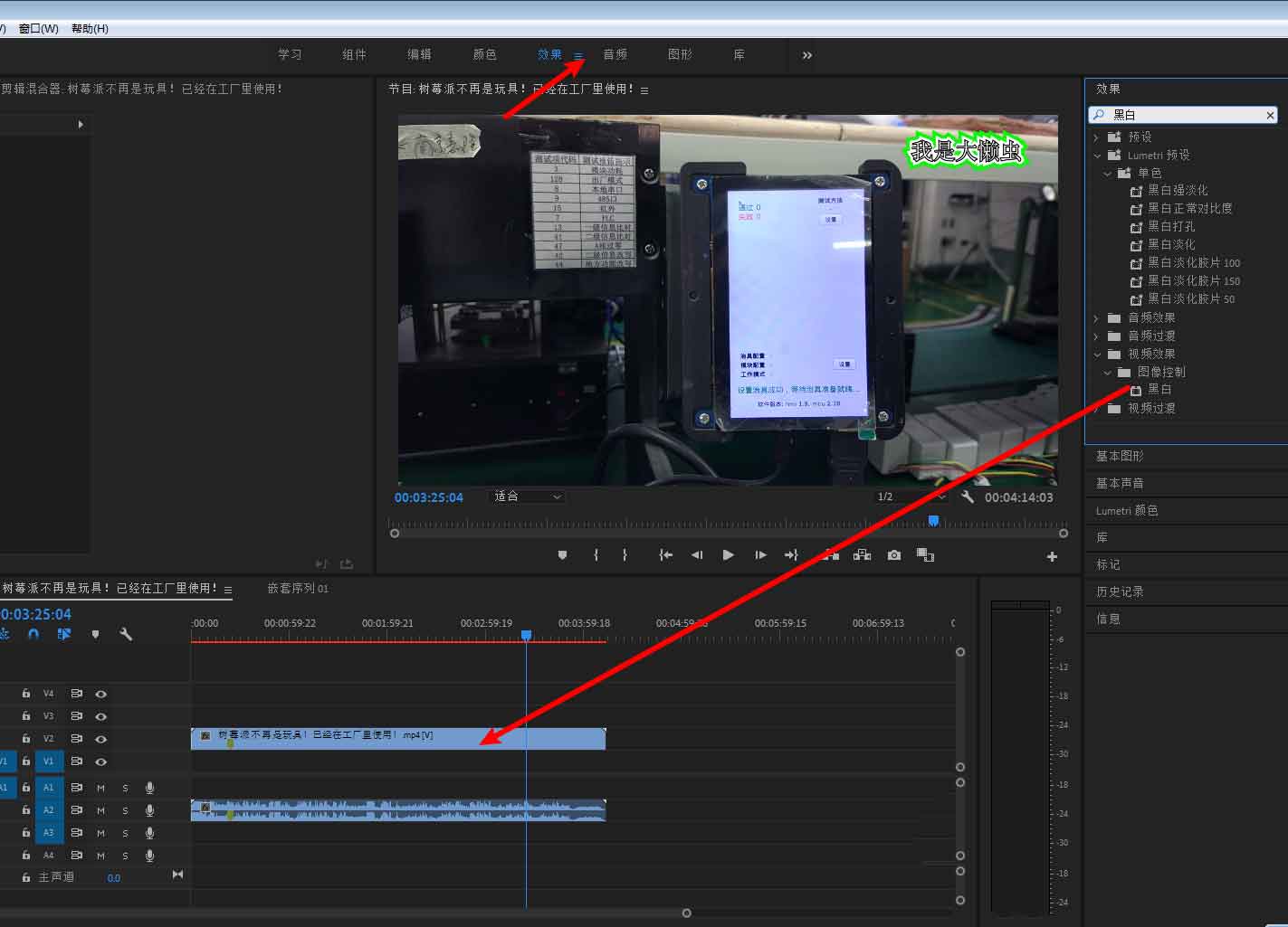 1、素材拉入时间轴,展开效果,把黑白加入到视频。