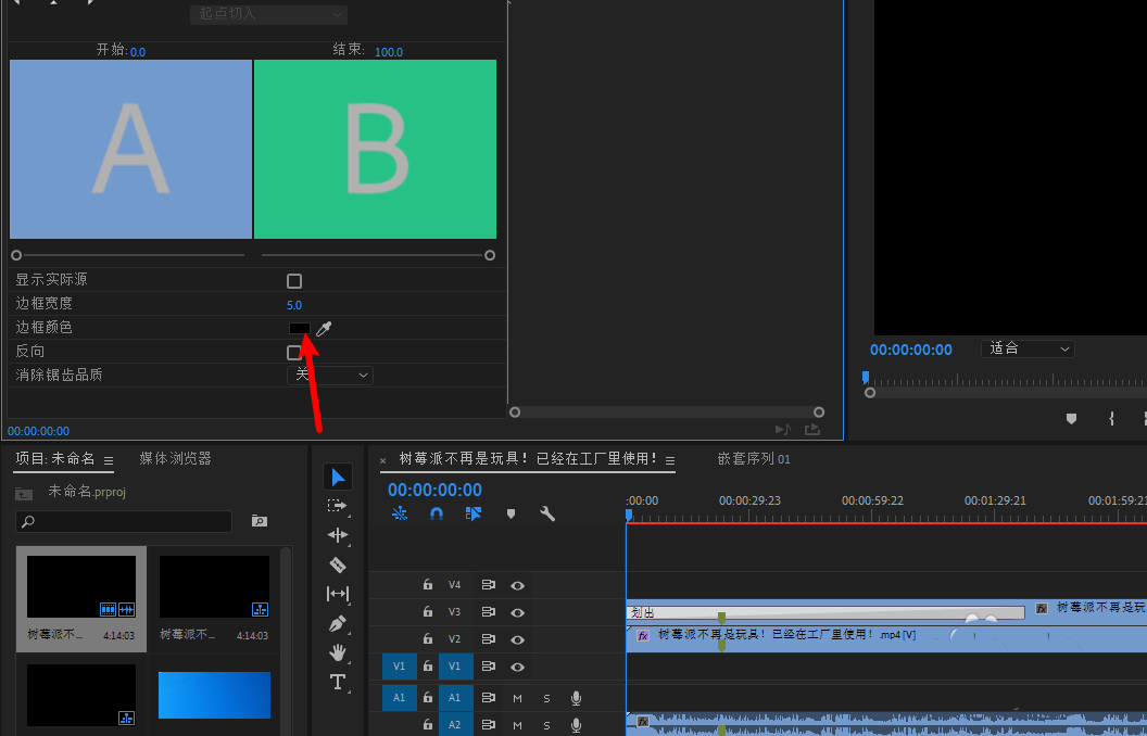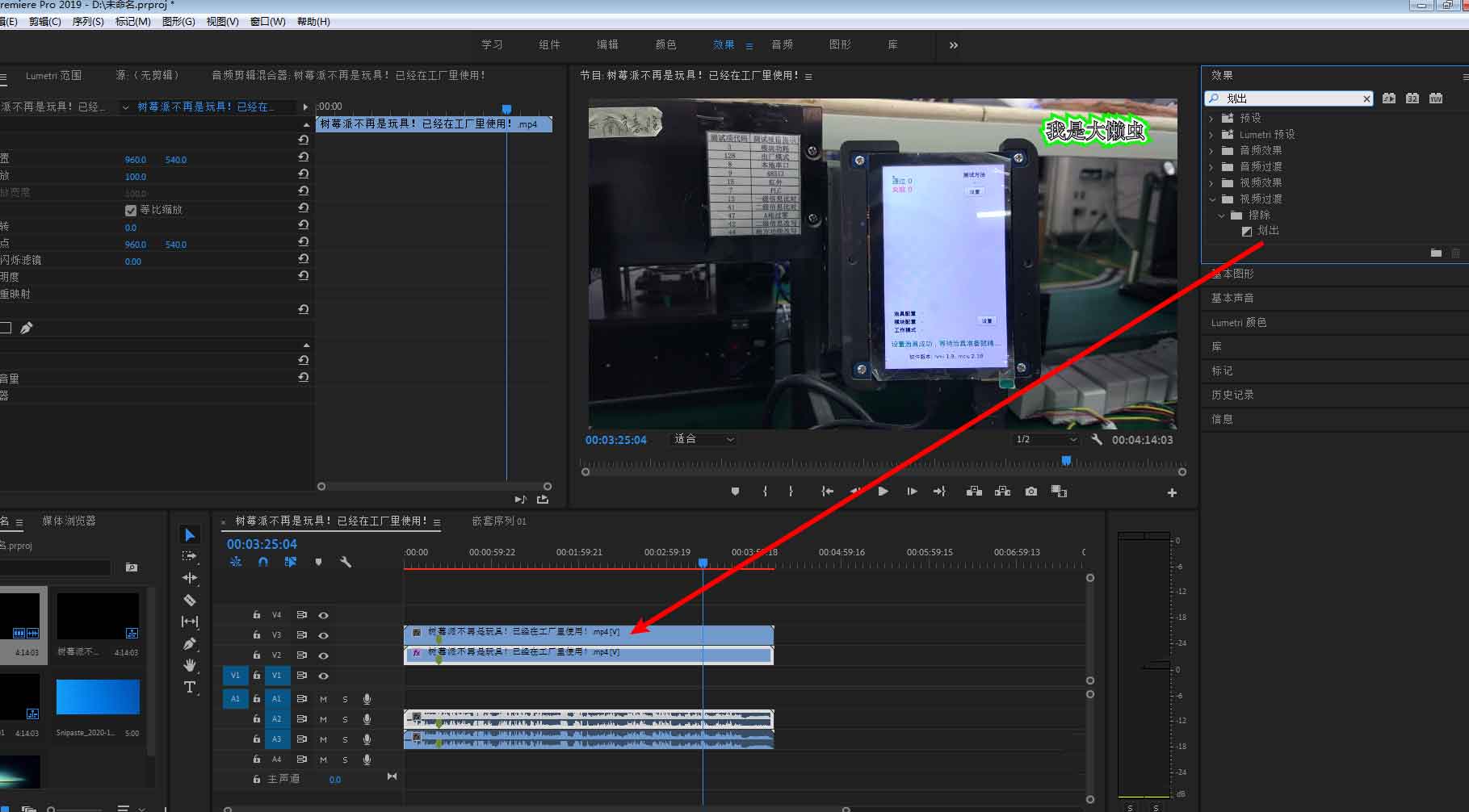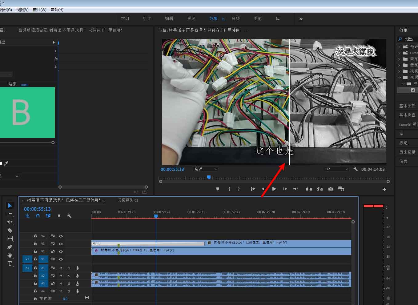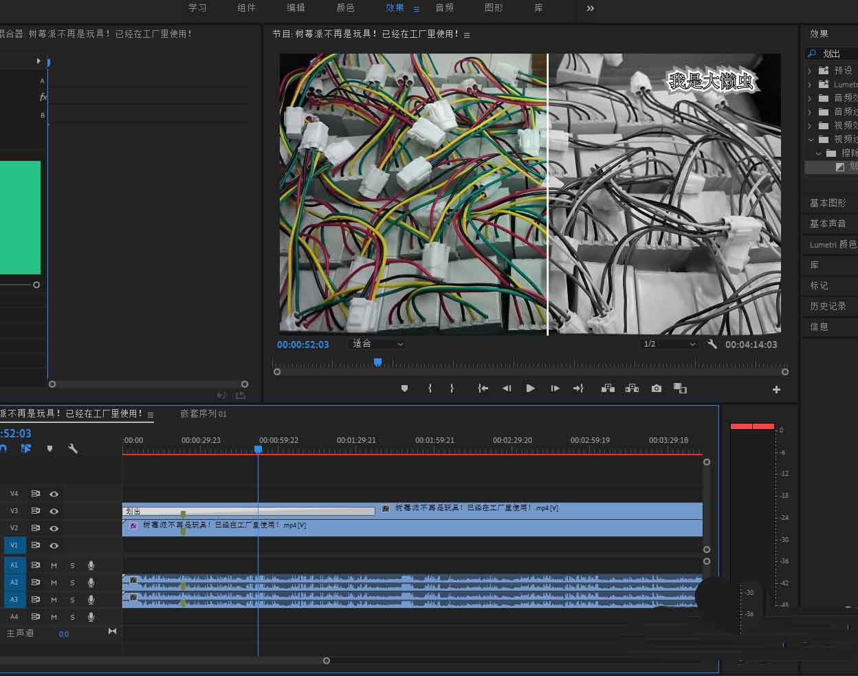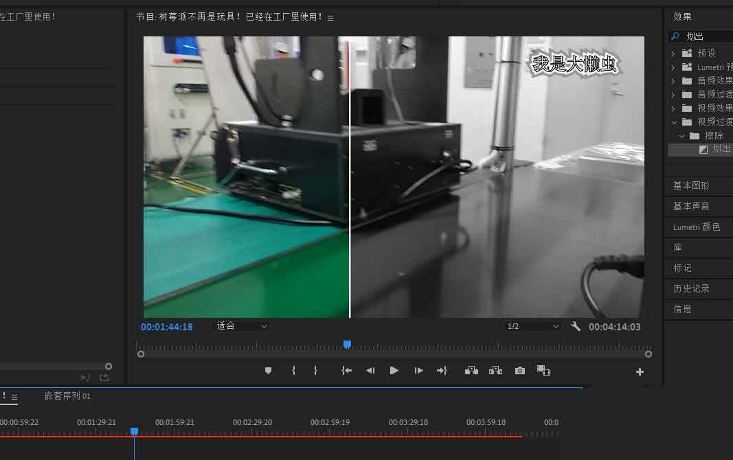 2、相同的视频,叠加在加了黑白效果上层,把划出效果,拉入到上层视频开始处,拉入视频内无效,需要把效果放到视频开头。
