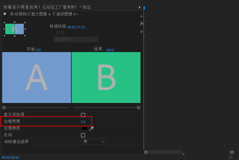 3、放大视频标签,然后鼠标放到划出效果中间右侧拉动划出效果,把效果拉到视频尾部,边框宽度设置:5.