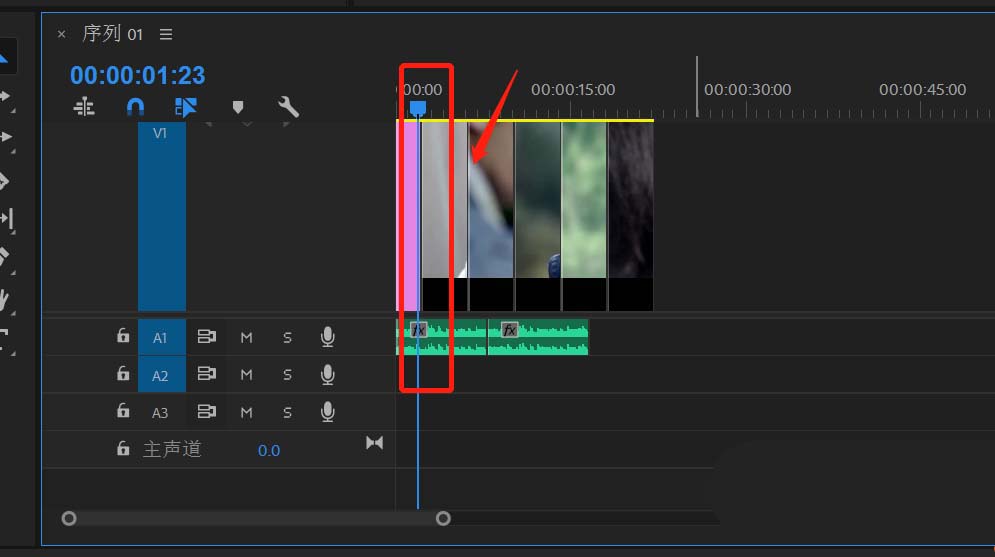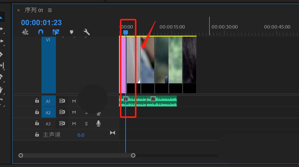 3、在视频轨道上选择需要转场过渡的时间节点。
