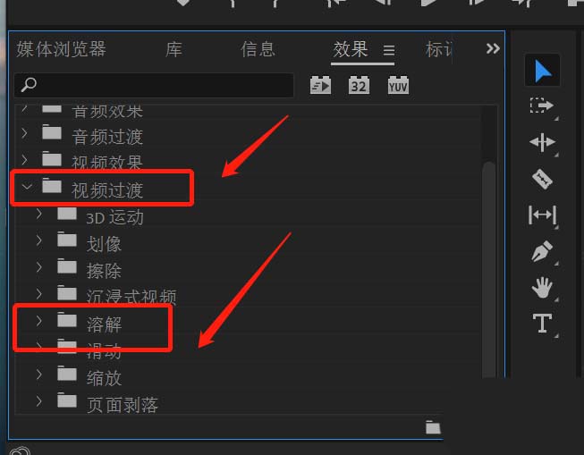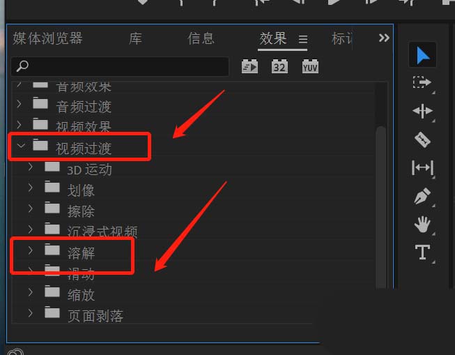 5、双击“视频过渡”,找到“溶解”,然后双击。