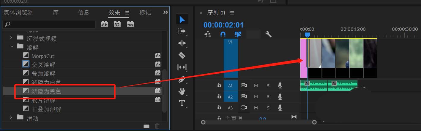 6、找到“渐隐为黑色”,用鼠标拖动“渐隐为黑色”到视频轨道所选的时间点上。