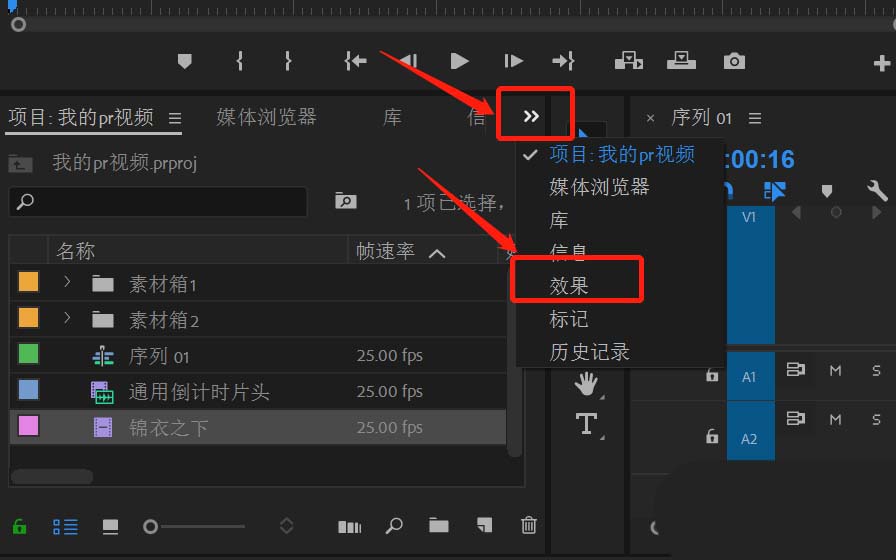 4、点击项目窗口的双箭头图标。点击“效果”调出效果控件。