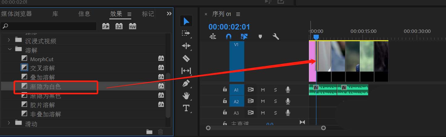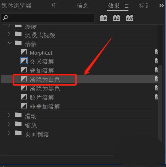 6、找到“渐隐为白色”,用鼠标拖动“渐隐为白色”到视频轨道所选的时间点上。