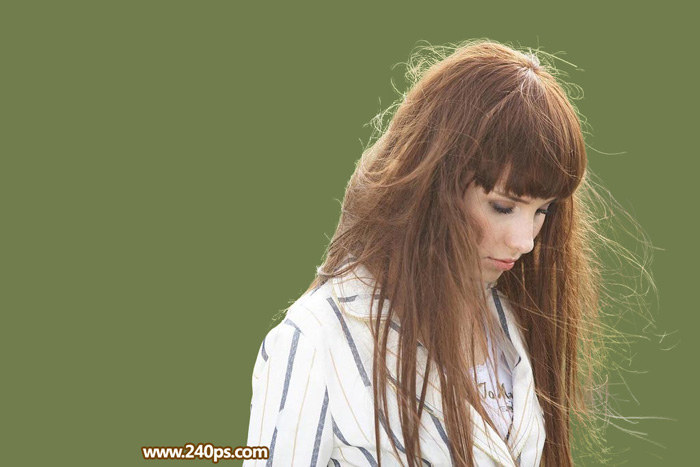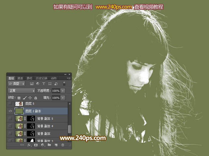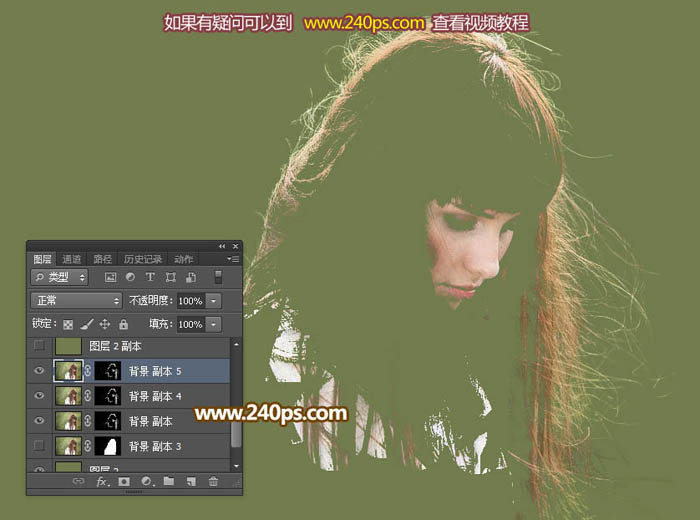 17、把背景图层复制一层,并添加图层蒙版,在背景图层上面新建一个图层,填充跟之前一样的暗绿色,如下图。这时候可以看到发丝效果,只是还不够明显。
