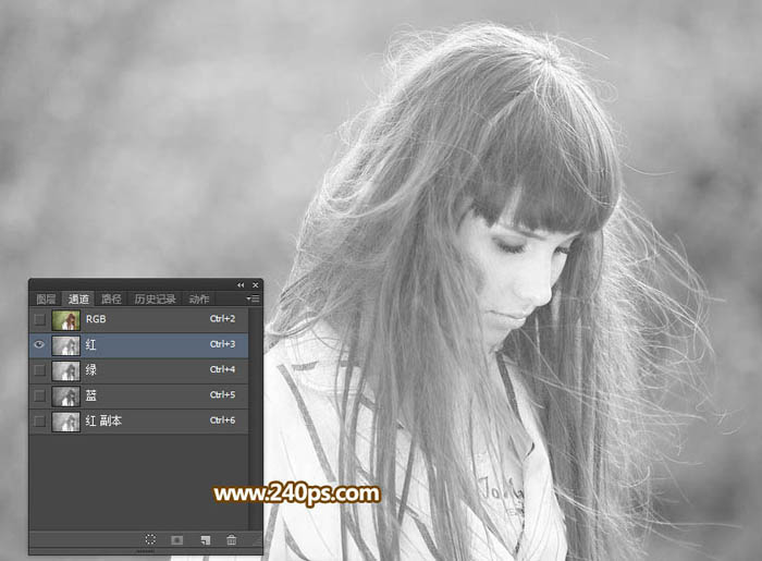 1、点击素材图片打开素材图片大图,右键选择“图片另存为”保存到本机,再用PS打开。 进入通道面板,查看一下各通道,红色通道发丝部分亮度比较均匀,同时发丝也比较白,非常适合;选择红通道,按Ctrl + A 全选,按Ctrl + C 复制。初学者可能觉得过程有点复杂,可以去视频教程中观看视频教程,这样就容易学一点。