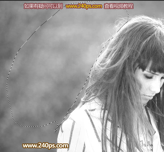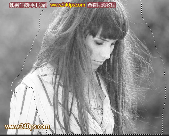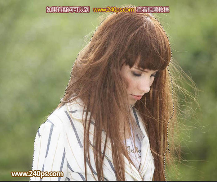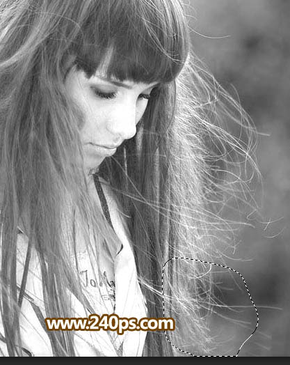 9、左侧的发丝有点过亮,用套索工具选取出来,把选区羽化15个像素。