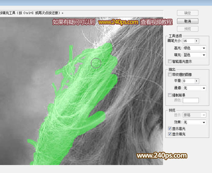 12、选择菜单:滤镜 > 抽出,把画笔大小设置为6像素左右,由左侧底部开始慢慢涂抹发丝。