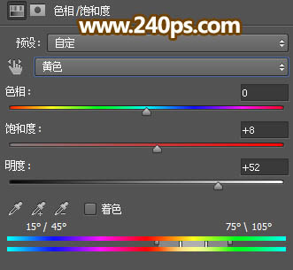 23、创建色相/饱和度调整图层,选择黄色然后调整,参数及效果如下图。