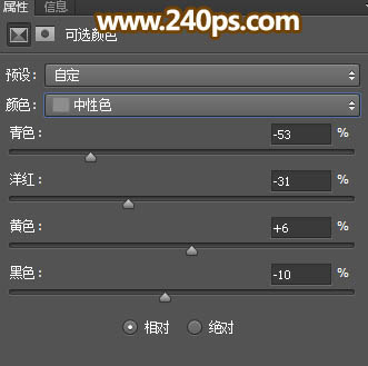 24、创建可选颜色调整图层,对中性色进行调整,参数设置如下图,确定后按Ctrl + Alt + G 创建剪切蒙版。