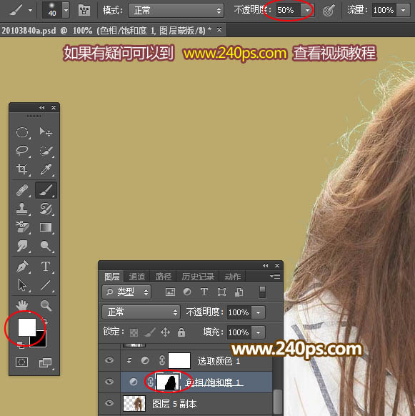 27、选择画笔工具,不透明度设置为50%,前景色设置为白色,然后在蒙版上操作,如下图。