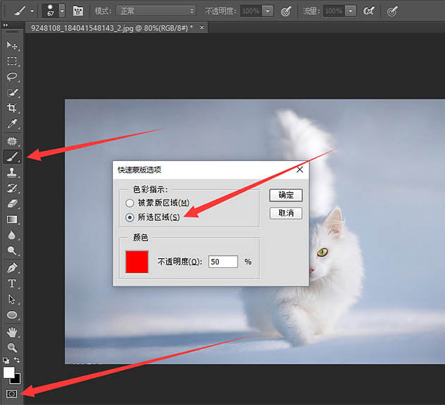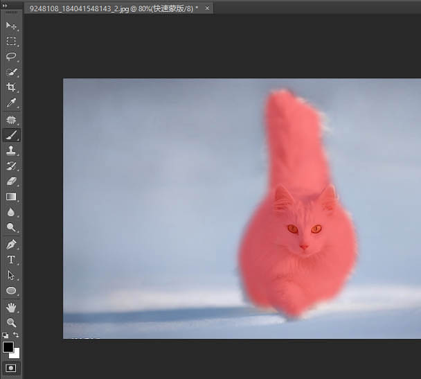 1、然后,Q一下,进入快速蒙版模式,B一下转画笔(注意检查前景色要为黑色),涂抹要抠出来的地方,Q一下,你就会得到一个选区。