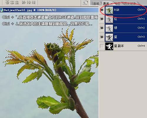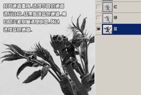 #p# 1、打开通道面板,选择不同的通道进行比较,结果发现蓝色通道,黑白层次分明,所以选择次通道。