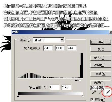 #p# 3、接下来亮部分别设置黑场与白场,是关键的两部。先点黑场,右下角红圈所示吸管,然后在图层上任意点选。
