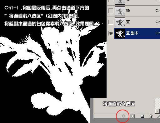#p# 5、按Ctrl I将图像反相,再点击通道下方的“将通道载入选区”,红圈所示的按钮。