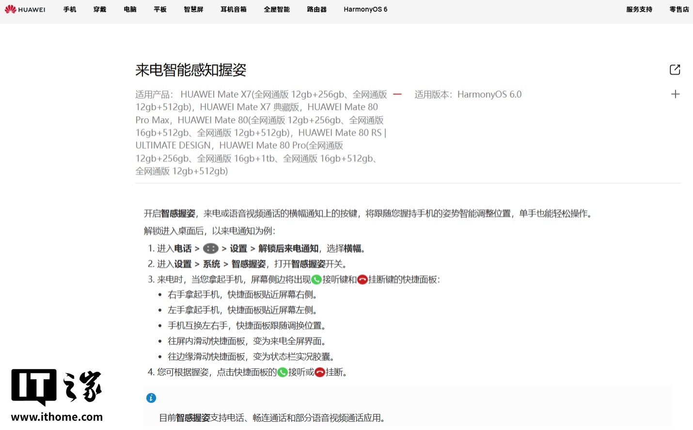 华为官网显示,目前智感握姿支持电话、畅连通话和部分语音视频通话应用。