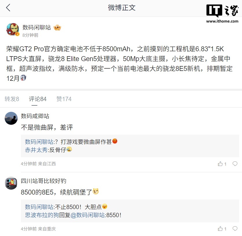 据此前援引博主消息,荣耀 GT2 Pro 官方确定电池不低于 8500mAh,之前的工程机是 6.83"1.5K LTPS 大直屏,骁龙 8 Elite Gen5 处理器,50Mp 大底主摄,小长焦待定,预定一个当前电池最大的骁龙 8E5 新机,排期暂定 12 月。