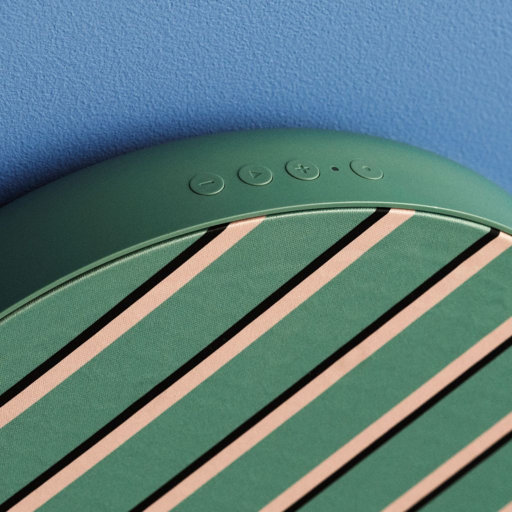 一款中等尺寸的音箱,采用绿色、棕色和米色的斜条纹设计。这两款音箱均配备底座,既可以独立放置,也能悬挂使用。