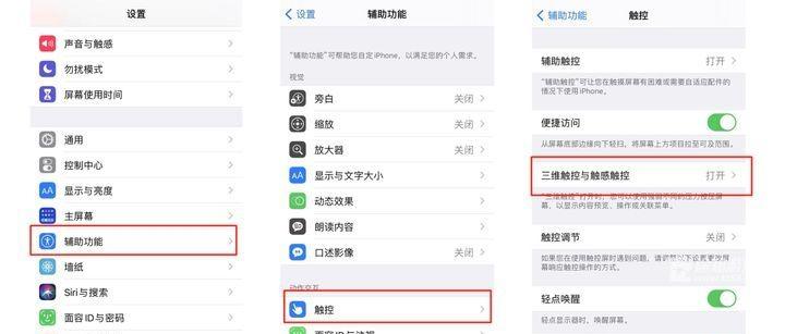 2、然后打开手机,「设置」-「辅助功能」-「触控」-「三维触控与触感触控」打开。