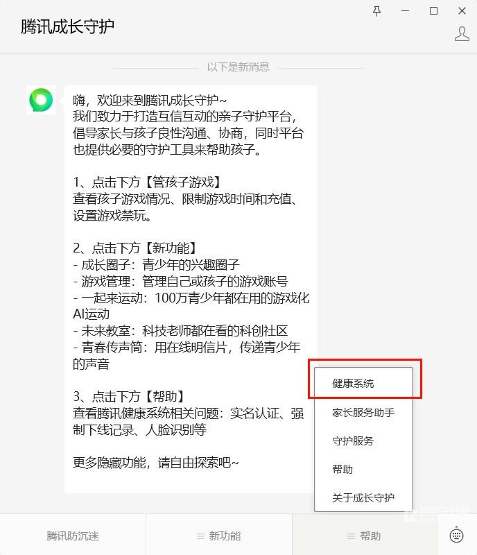 1、关注微信腾讯成长守护公众号,点击帮助导航栏,选择【健康系统】。
