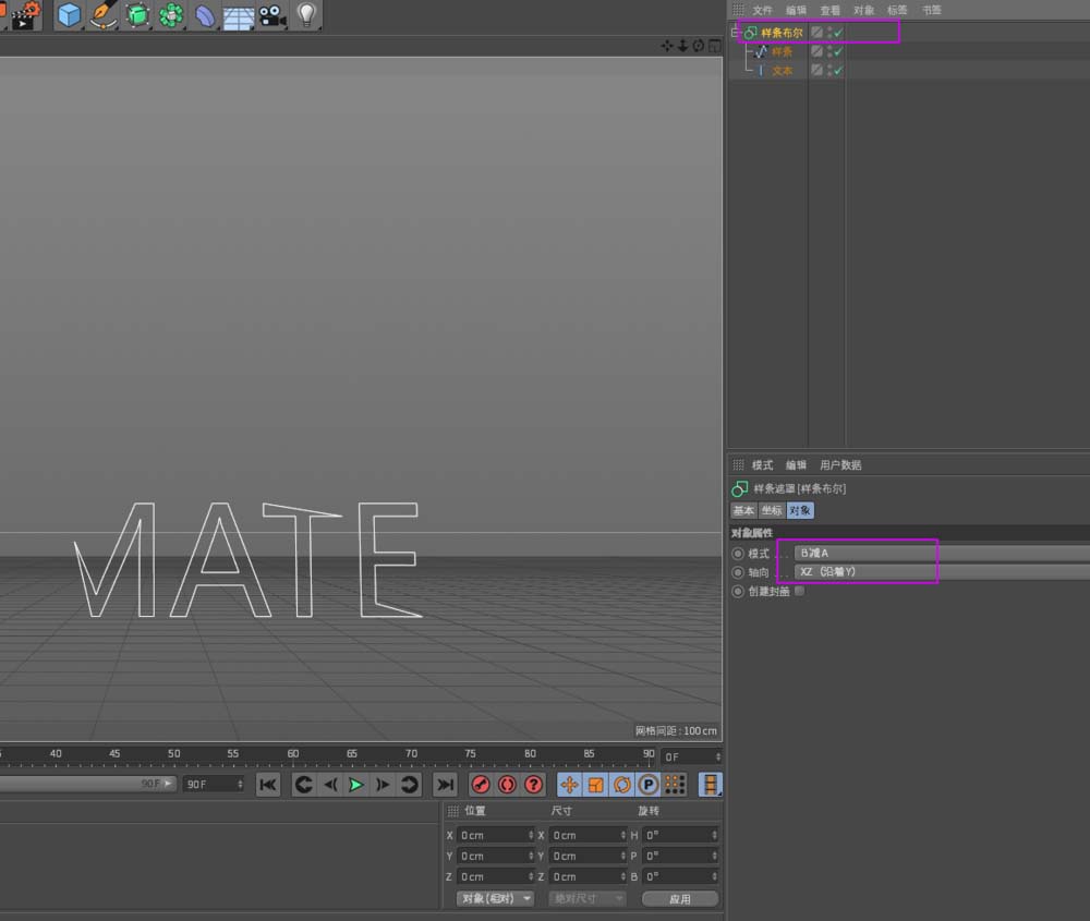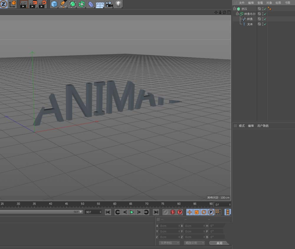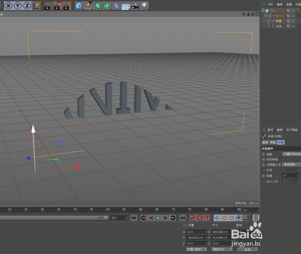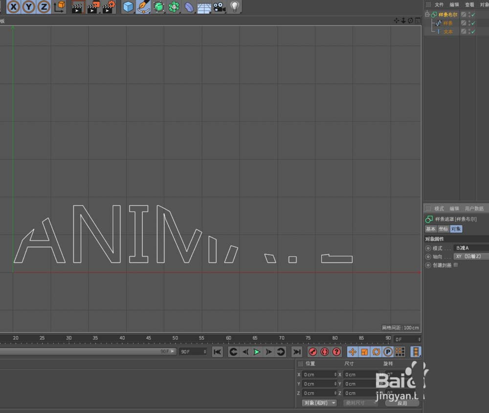 1、如图所示,需要用【样条布尔】,来做样条与文本的布尔运算,文本会自动分布在XY平面坐标系,样条是画笔绘制的