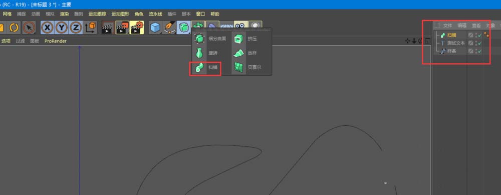 4、创建扫描工具,将文本样条图层和普通样条图层,放置扫描工具下面;一定要截面-样条这种排序放置;