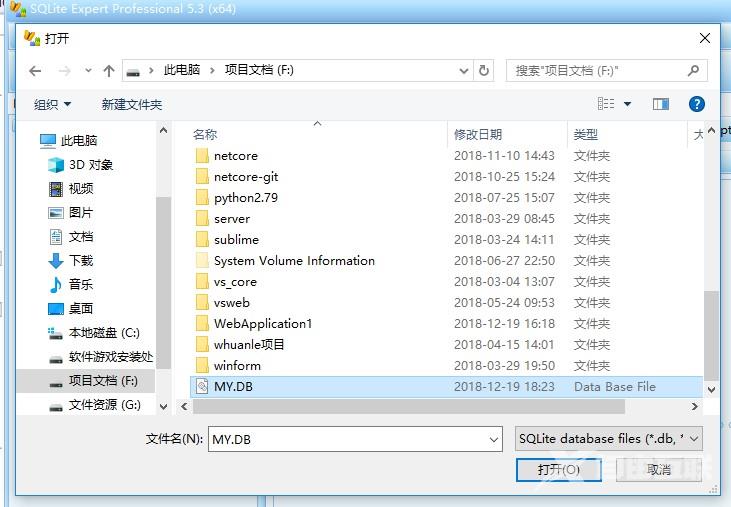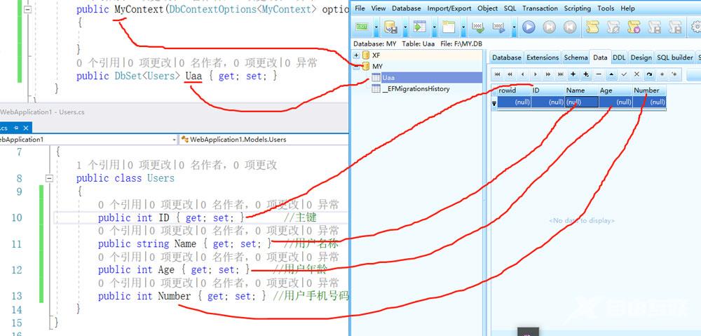 然后你会发现解决方案管理器,多了Migrations 目录和一些文件,F: 目录也多了一个MY.DB文件
