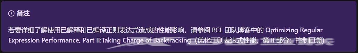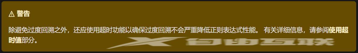 开发模式时,应考虑回溯对正则表达式引擎的性能的影响程度,特别是当正则表达式设计用于处理不受约束的输入时。 有关详细信息,请参阅控制回溯部分。