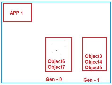 现在,再次运行垃圾收集器,它涉及到第 0 代存储桶和检查使用的对象。假设应用程序未使用这两个对象(Object6 和 Object7),因此它将删除这两个对象并回收内存。