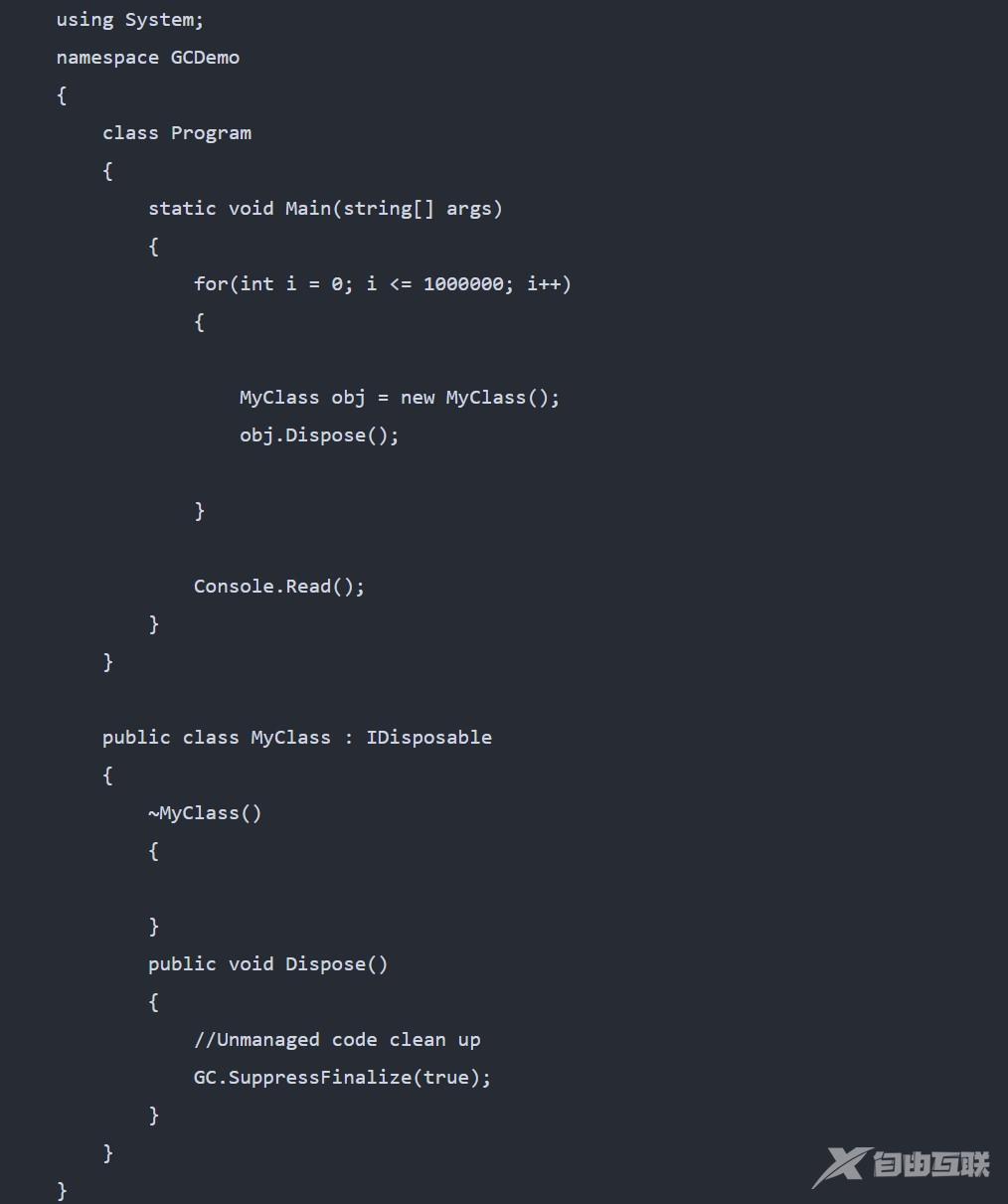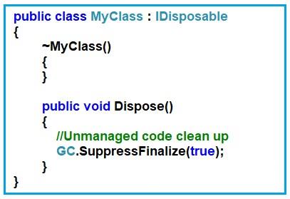为了实现这一点,类应实现 IDisposable 接口,并提供 Dispose 方法的实现。在 Dispose 方法中,您需要为非托管对象编写清理代码,最后需要调用 GC。通过将 true 作为输入值传递来抑制无限化(true) 方法。