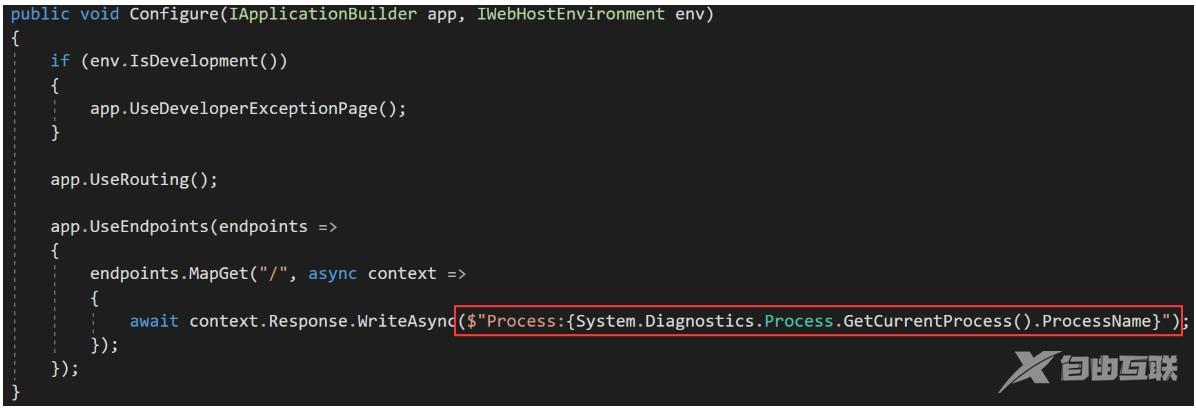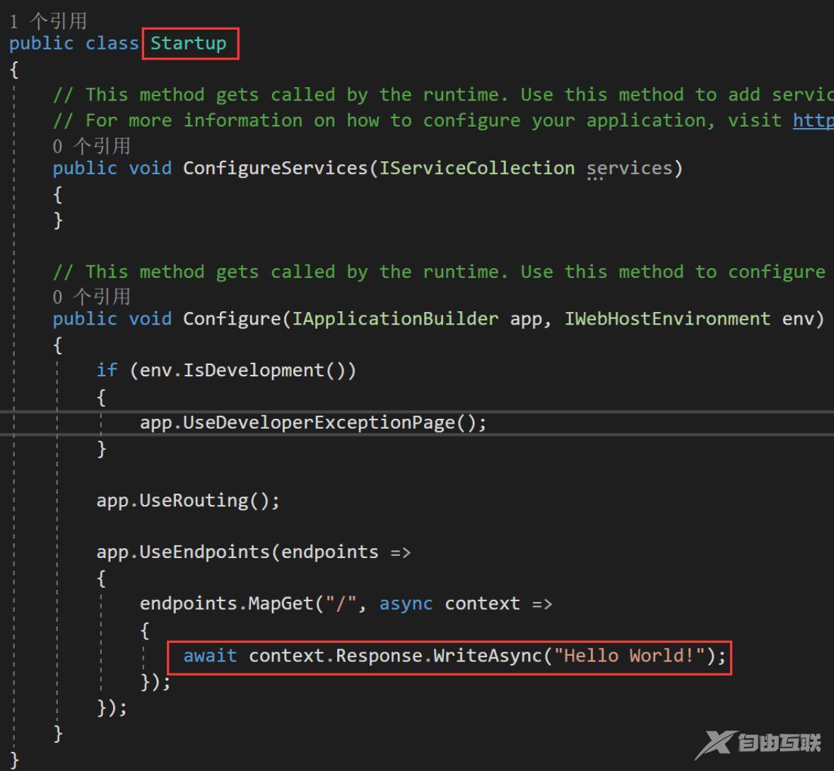 下面, 标记了输出“Hello World”位置的代码片段, 位于Startup类的Configure()方法中, 如下所示。