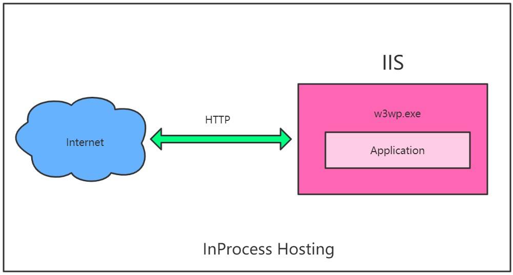 在ASP.NET Core中,使用 Inprocess 托管模型,我们的应用程序将在 IIS 工作程序中托管。最重要的一点,需要记住的是,我们只有一个Web服务器,即 IIS服务器的情况下,InProcess托管,这将托管我们的应用程序,如下图所示。