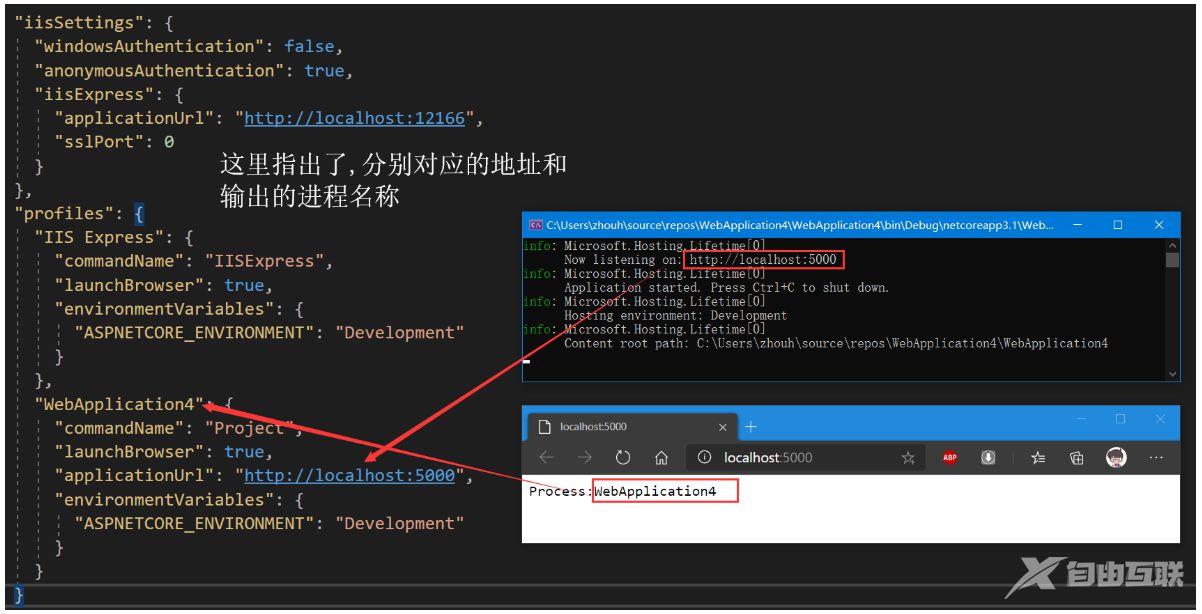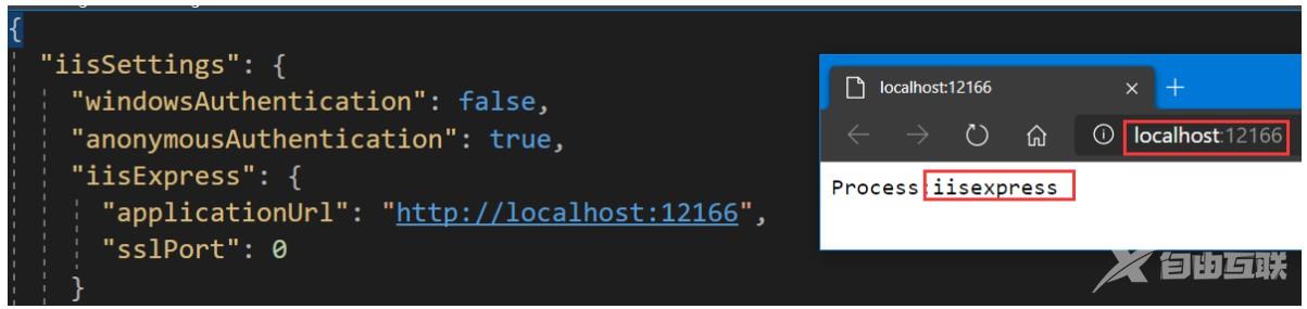 如果您使用 IIS Express 运行应用程序,则它将使用启动设置.json 文件中提及的 URL 和端口号。若要证明这使用 IIS Express 运行应用程序,请参阅如下所示的输出(左边是配置文件、右边是浏览器输出)。