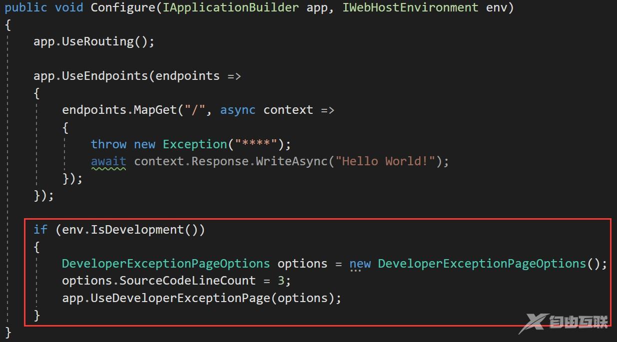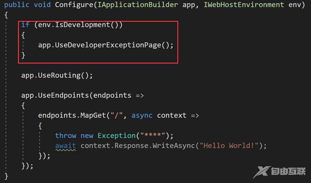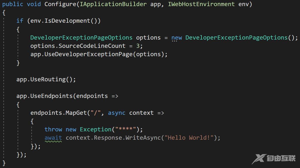 为此,请修改Startup类的Configure 方法,如下所示,以添加开发人员异常页中间件,该中间件将处理应用程序中发生的未处理异常。