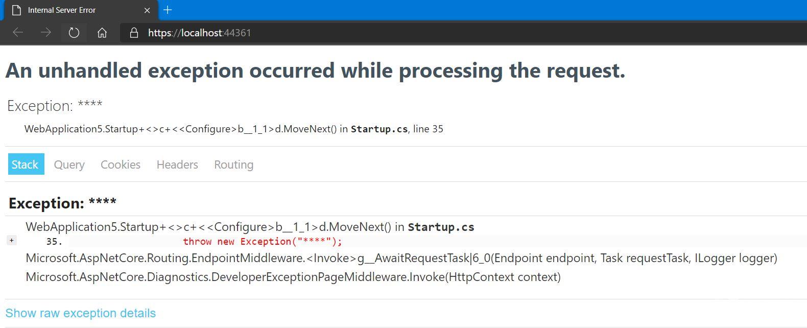注意:仅当应用程序在开发环境中运行时,才应启用“开发人员异常页面中间件”。 当应用程序在生产环境中运行时,您不想共享详细的异常信息。