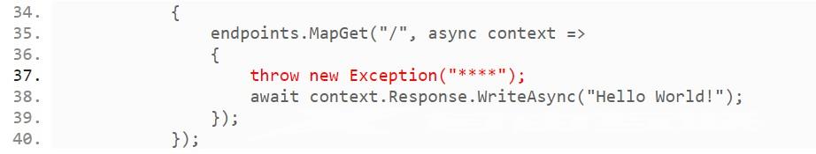 我们需要在应用程序的请求处理管道中尽早配置UseDeveloperExceptionPage()中间件,以便它可以处理未处理的异常,然后显示带有异常详细信息的Developer Exception Page。
