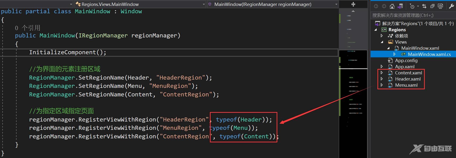 当我们为界面的元素指定了区域名称(XAML或者代码的方式), 下一步则是通过IRegionManager接口实例设置对应的区域显示内容。