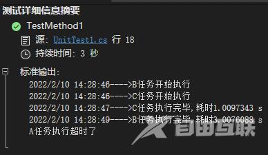 眼尖的同学已经看到最后一张图,B任务执行了3.0076088s,按道理B任务是已经超时了,这段话是不会输出的,那如果我让主线程晚点退出,那超时的子线程是否能正常执行, //await Task.Delay(3000); 将这段代码取消注释,再来观看结果