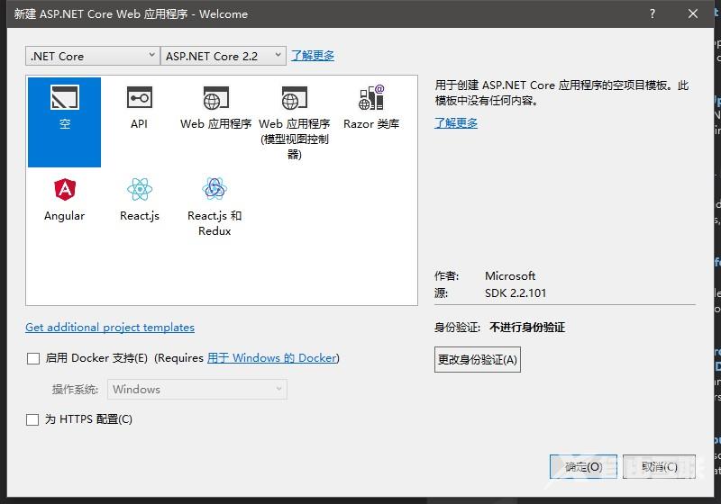 选择Core 2.2, 选择空的模版, 这样才能一步步理解ASP.Net Core MVC
