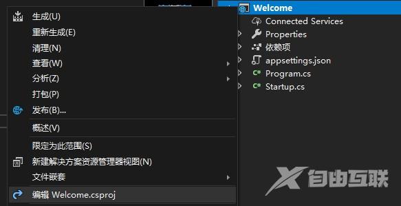 - Welcome.csproj. 这个文件在VS里面是看不到的, 但是在硬盘上能看到, 如果需要在VS里面查看, 右键项目, 编辑Welcome.csproj即可, 如图