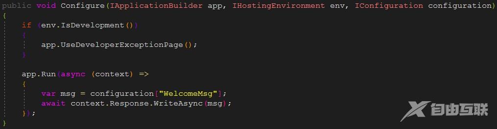 我配置了一个新的欢迎语, 然后去取这个值, 取值需要注入一个IConfiguration接口对象, 才能去获取配置信息, 我们在Startup类里面的Configure方法的参数进行注入, 注入之后进行取值, 修改默认输出的Hello World!, 代码如图